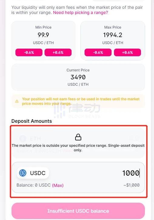 這時我們看到,上圖中現貨價格的下方出現了一行黃色的小字,提示用戶在這個區間內做市,可能無法賺取手續費收入。但是不要緊,LP依然可以在這個價格區間提供流動性,沒準明天ETH就能漲到4000多美元呢。這里需要注意的是,在這種情況下,我們提供的做市資金不再由兩個幣種組成。先看下方截圖,我們還是輸入要提供的1個ETH。這時可以看到,在原來會自動返回USDC數量的地方,已經變成了一把小鎖。這時用戶千萬不要認為是自己做錯了什么,也并不是因為你沒有對交易對授權。這里僅僅是因為做市價格區間完全高于現貨價格,導致用戶只需要提供單一幣種就可以完成做市。