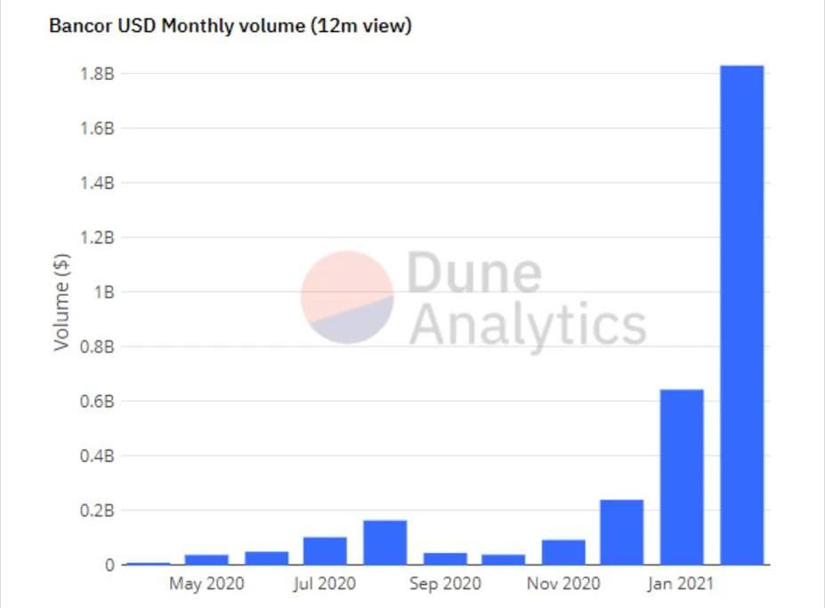 盡管Uniswap取得了巨大的成功,而且SushiSwap等類似的競爭對手也在崛起,但Bancor團隊仍然堅持對他們的原始產品進行迭代。隨著Bancorv2.1在2020年10月發布,單邊流動性供應和無償損失保險的結合似乎是在競爭激烈的去中心化交易所領域取得突破所需要的提議USP。這明顯反映在一些指標,如總鎖倉量和協議更新以來的交易量的增長中。