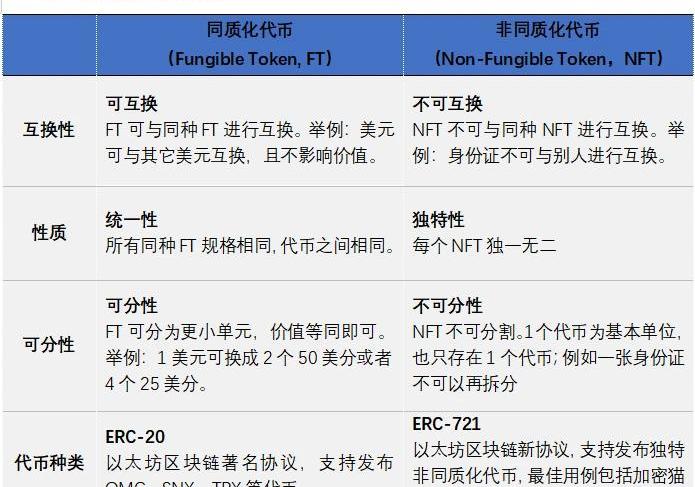 想要理解什么是NFT,需要了解目前區塊鏈行業里中幾種代幣開發的標準。我們都知道以太坊可以發行代幣。從技術角度看,這些代幣又可以分為以下兩種類型:1)同質化代幣:又稱可互換型代幣,主要由ERC-20標準產生,各代幣可隨意交換,拆分整合;2)非同質化代幣:又稱不可互換型代幣,主要有ERC-721標準產生,最小單位為1,不可拆分,也不可相互替代;