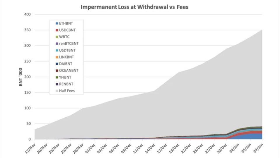 資料來源:Bancor滿足上述條件,流動性提供者即可在撤出流動性時同時獲得Bancor的無常損失保險。而保險的費用則來自協議共同投資的手續費收益,但如果收益不足以100%償還流動性提供者的無常損失,協議就會增發BNT作為理賠金,這意味著,保險的成本將由所有BNT持有人共同攤薄。