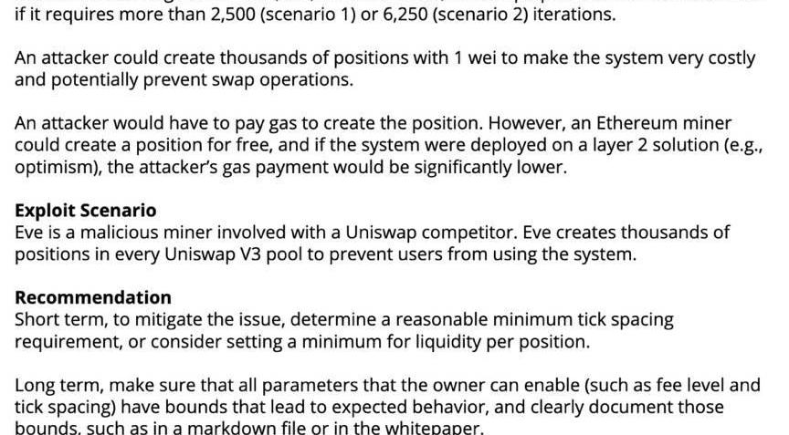 你可以想象,每個「小桶」里都有自己獨立的流動性提供者,如果某筆交易耗盡了一個「小桶」中的流動性,那么剩余的交易就會進入下一個「小桶」。低滑點交易不會被允許跨越多個「小桶」這意味著,作為流動性提供者,如果你在USDC/ETH交易對價格區間為1600-1800美元時提供流動性,實際上這些流動性會被存入到100個「小桶」里。許多人已經注意到:這個模式看起來很像交易委托賬本,是的,是有點像!從某種意義上來說,UniswapV3是針對Layer2量身定制的。一旦UniswapV3上線,Layer2上的資金就會更少,但是活躍交易和頭寸管理、以及交易委托賬本樣式成本會更低。UniswapV3可以「優雅」地提高集中流動性和資本效率。但是,對于那些跨越多個「小桶」的交易來說,成本也許會變得更高。除此之外,在多個「小桶」之間進行流動性提款和存款的交易成本也會更加昂貴。TrailofBits在他們的審計報告中給出了一些意見,如下圖所示: