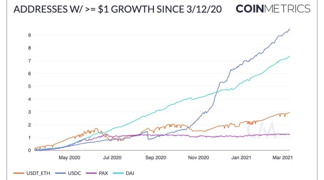 來源:CoinMetricsNetworkDataCharts從圖中去掉USDT_TRX可以看出,其他大部分主要穩定幣也有較大增長。USDC在2021年特別強勢,自2020年3月以來,持有至少1美元的地址增加了9倍多,達到約493K。