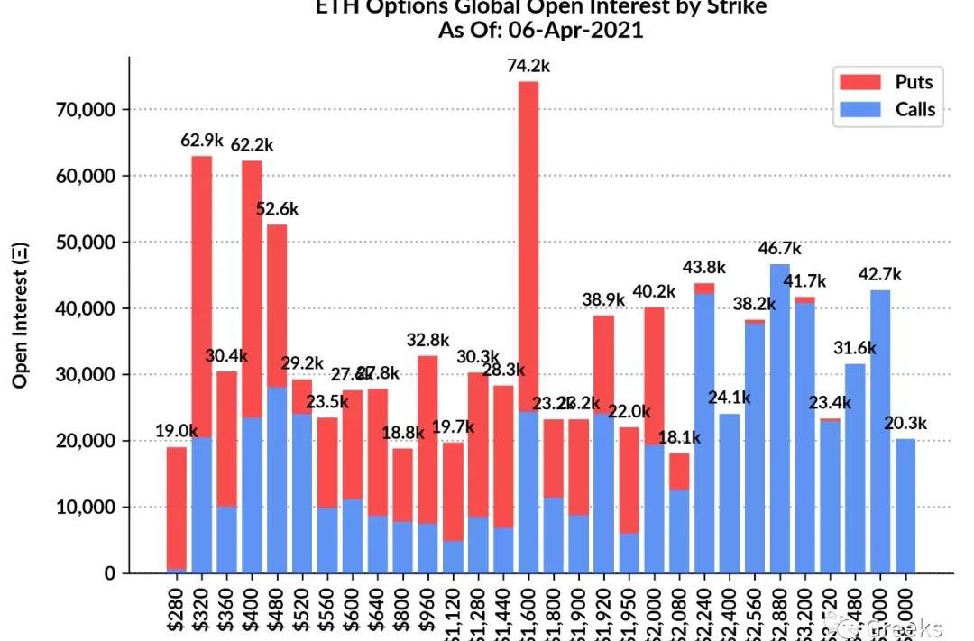 從OptionFlows數據看,各方向相對平衡。大宗交易成交量上升,主要以當月的平值和淺虛值看跌為主,不同于比特幣的是虛值看漲成交也不少。以太坊目前4月期限大約是26.2萬ETH,短期持倉量明顯上升了,6月期限大約是39萬ETH,以太坊的持倉量已經多日未變了。