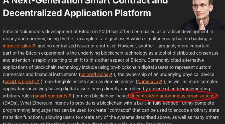 V神在2013年的以太坊白皮書內就首次提及DAO。在先前為比特幣雜志《BitcoinMagazine》撰文時他就嘗試提出并回答“我們是否可以從另一個方向來處理這個問題,即使我們仍然需要人類來完成某些特定的任務,但我們是否可以把管理部分從系統中移除?”
