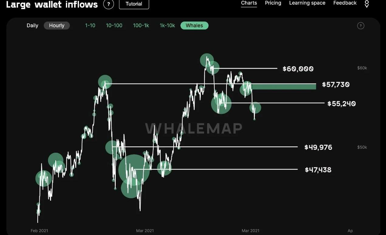 來自CoinbasePro的BTC流出資料來源:CryptoQuant雖然無法確定流出量是鯨魚積累的結果,但來自Whalemap的分析顯示,在$55,000的水平上已有大量的資金沉淀,但研究人員告誡說,如果價格真的跌破當前支撐位,則下一個強大的支撐位則是47,438美元。