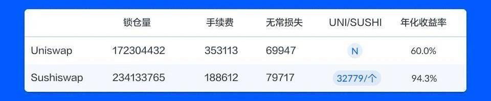表1:Uniswap和Sushiswap的無常損失計算/美元根據無常損失、鎖倉量、手續費和分發的治理代幣價值可以計算出LP的年化收益率。