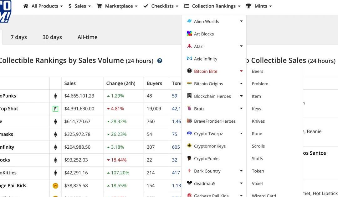 這里附上一些查詢工具,供讀者參考。CryptoSlam是統計相對全面的數據平臺,一些新項目也會快速列入統計范圍,方便對比查看。在收藏品系列中,也做的很詳細,如下圖所示。地址:https://www.cryptoslam.io/