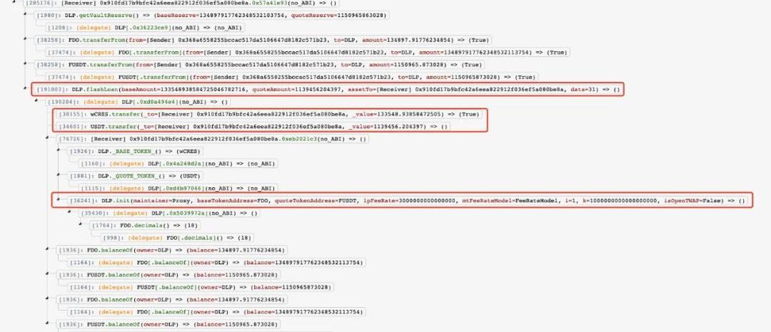 通過查看本次攻擊交易,我們可以發現整個攻擊過程非常短。攻擊者先將FDO和FUSDT轉入wCRES/USDT資金池中,然后通過資金池合約的flashLoan函數借出wCRES和USDT代幣,并對資金池合約進行初始化操作。