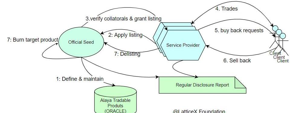 圖3.2.5授權協議概念圖注:實際應用中,可以同時有多個種子分別形成不同的授權體系。3.3資產服務:可交易貨幣對的上/下架協議-AlayaStandardAssetProtocol&ProtocolGovernance3.3.1可交易金融產品清單-AlayaTradableProductList由授權服務機構定義,或者由官方種子權威機構定義,以ORACLE服務形式提供。例如:服務開始階段僅限主流合規現貨貨幣對。BTC、ETH等,而Future/Options等衍生產品暫緩上架。可交易金融產品清單的判斷建議:一定規模以上可持有的合規資產機構有一定投資需求,有一定規模流動性的資產3.3.2可交易貨幣對的上/下架協議及協議治理-AlayaStandardAssetProtocol&ProtocolGovernance線下資產抵押認證,線上資產發行Native發行,線下資產抵押流程,線下有資質合規資產初始質押審計證明,定期公示,附帶保險等相關流程。ARC20發行,線下流程與Native發行相仿。跨鏈鎖倉發行,實質上在行使客戶資產托業務。資產跨鏈實施之前需要完成客戶資產托管業務資質、業務管理等。發行資產的全額贖回、部分贖回已發行資產的全額下架,相當于線上相應額度資產的銷毀和線下資產質押的解除。出于投資者保護的目的,流程上確保充分周知,分階段贖回,以及對贖回失敗情況的備用措施。3.3.3資產服務概念流程
