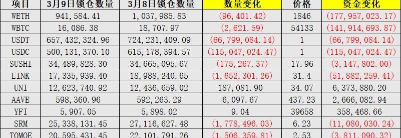 我們逐一對照BDP的12個資金池的鎖倉代幣,確實如此。其中WETH、WBTC、USDC資金出逃明顯,都超過了1億美元。只有YFI、AAVE、UNI三種資金是流入狀態,但金額較小,只有百萬美元級別。