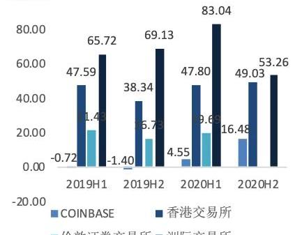 新冠疫情爆發以來,全球經濟形勢越發低迷,人們將焦點轉向加密貨幣行業,加密貨幣爭先面世,帶動了虛擬資產交易平臺的業務發展。Coinbase的營業收入從2019年下半年度的18.20億元,迅速暴漲至2020年下半年的56.66億元,復合半年增長率高達76.44%。Coinbase營業收入規模目前尚未可以與傳統交易所巨頭一較上下,但差距在迅速縮縮小,2020年下半年僅與香港交易所相差21.68億元。同時COINBASE增長潛力巨大:在2020年,其他證券交易所營收水平紛紛有所下滑,Coinbase卻一騎絕塵,營收半年增長至年初的2.12倍。在凈利潤方面,隨著加密數字貨幣的大放異彩,各大加密市場交易所交易量迅速攀升,Coinbase在2020年首次實現盈利,并且從上半年的0.45億元迅速增長262.48%至年末的1.65億元,香港交易所、洲際交易所2020年半年僅增長了2.57%、-35.86%。圖九:營收增速高達76.44%