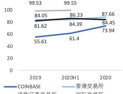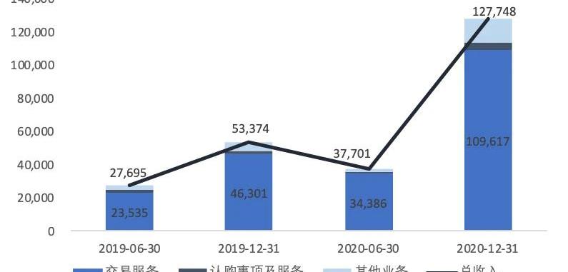 眾所周知,獲取比特幣的方式有兩種,第一種是利用部署復雜強大的計算機,通過解決復雜的數學問題來挖掘比特幣,或者在交易所購買比特幣。前者的成本高得離譜,需要大量的技術知識,而后者只需要在上述交易所開一個賬戶即可,其中Coinbase就是此類交易所中的佼佼者。Coinbase的主營業務是提供在線交易平臺,允許買家和賣家相遇并以合適的價格進行投資,花費,發送和接收,存儲,保存,抵押,借貸以及出借,分發,構建,支付以及更廣泛地使用加密資產進行訪問和交易。其收入構成包括以下幾個部分:交易收入,認購事項及服務收入和其他業務收入。交易收入包括從平臺上發生的交易費中的凈收入。公司對加密貨幣的購買和銷售收取約0.50%的費用,不過這個費率會根據市場情況而變化。從2019年中到2020年底,交易服務收入從23535萬美元上升至109617萬美元,漲幅366%。交易服務收入是營業收入中最重要的組成部分,約占比86%。認購事項及服務收入包括存儲、抵押、分發和構建。這些收入是使用利息法計算的,利息收入取決于托管法定資金的余額和當前的利率環境。認購事項及服務收入約占總營業收入的4%。從2019年到2020年,該項收入漲幅約355%。其他業務收入包括出售加密資產收入。公司定期會使用自己的加密資產來完成客戶交易。在一些小額訂單出售給客戶之前,公司對這些訂單中的加密資產進行保管和控制,并在處理銷售的時間點記錄收入。公司將銷售的總價值記錄為收入,并將加密資產的成本記錄在其他運營費用中。其他收入還包括通過現金和現金等價物專賺取的利息收入。這類收入約占總收入的11%,在過去一年內上升329%。表二:認購事項及服務收入