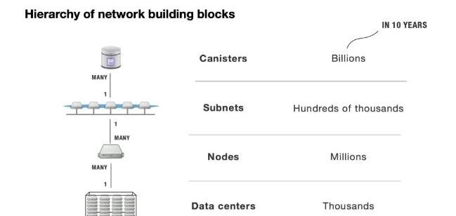 簡單來說,DFINITY在基于區塊鏈技術創建一個巨大、永不停歇的互聯網計算機,基于這個網絡可以承載更多的應用,開發者可以直接在這個互聯網本體上構建程序和應用,不需要云服務、數據庫或各種類型的接口等。并且由于不需要考慮很多中間件,還可以實現無縫連接地構建應用。2、DFINITY的運作機制以及通證DFINITY基于區塊鏈計算協議ICP運行,采用了分層結構,主要包含軟件容器、子網、節點以及數據中心。它可以看作是由很多個子網組成,在每個特定功能和屬性的子網中有多個軟件容器,在軟件容器中包含了用戶上傳的代碼和狀態。DFINITY的最底層是托管專用硬件的獨立數據中心,數據中心之上運行節點,節點負責處理子網容器中的數據和狀態執行。