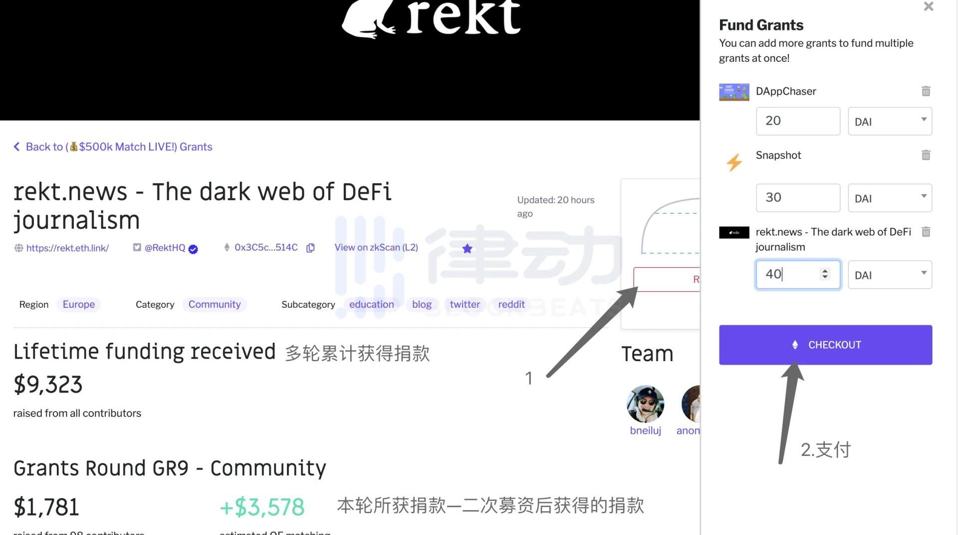 共計向三個項目捐款0.3個ETH,需要支付0.02ETH,約36美金的Gas費。6.2使用zkSync進行結算點擊CheckoutwithzkSync進行結算。zkSync詳細使用教程可以參閱《Layer2使用教程系列一:教你使用幾大Layer2應用》。