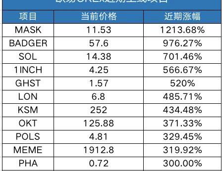 XRP/HKD+0.55%3月14日,比特幣一舉突破6萬美元大關,加密貨幣市場再度沸騰。瘋狂之下,幾家歡喜幾家愁。有人安安穩穩囤幣,年內收益數倍;有人一股腦沖入DeFi新礦,本以為可以薅頭羊,結果數十萬本金打水漂;還有人在微信群參與私募,打款之后卻再也聯系不到發起人……市場一遍又一遍告訴我們:牛市中賺錢的始終是少數。對于大部分投資者來說,如何在市場狂熱階段依然保持清醒,選擇靠譜交易平臺,布局優質標的,考驗著眼力,更考驗著定力。盡管Uniswap等DEX自去年風生水起,但假幣泛濫、Gas費高昂等問題遲遲無解,整個市場最大的流量入口依然是中心化交易所,而頭部交易所因具有嚴格的上幣標準,歷來被視為優質項目的嚴選平臺。綜合對比之下,頭部交易所中的“三大”表現突出,成為大部分投資者挑選明星項目的第一站。不過考慮到友商或被調查,或深陷項目跑路風波,歐易OKEx客觀上成為牛市行情中最重要的價值發現平臺。12個明星項目平均漲幅超500%