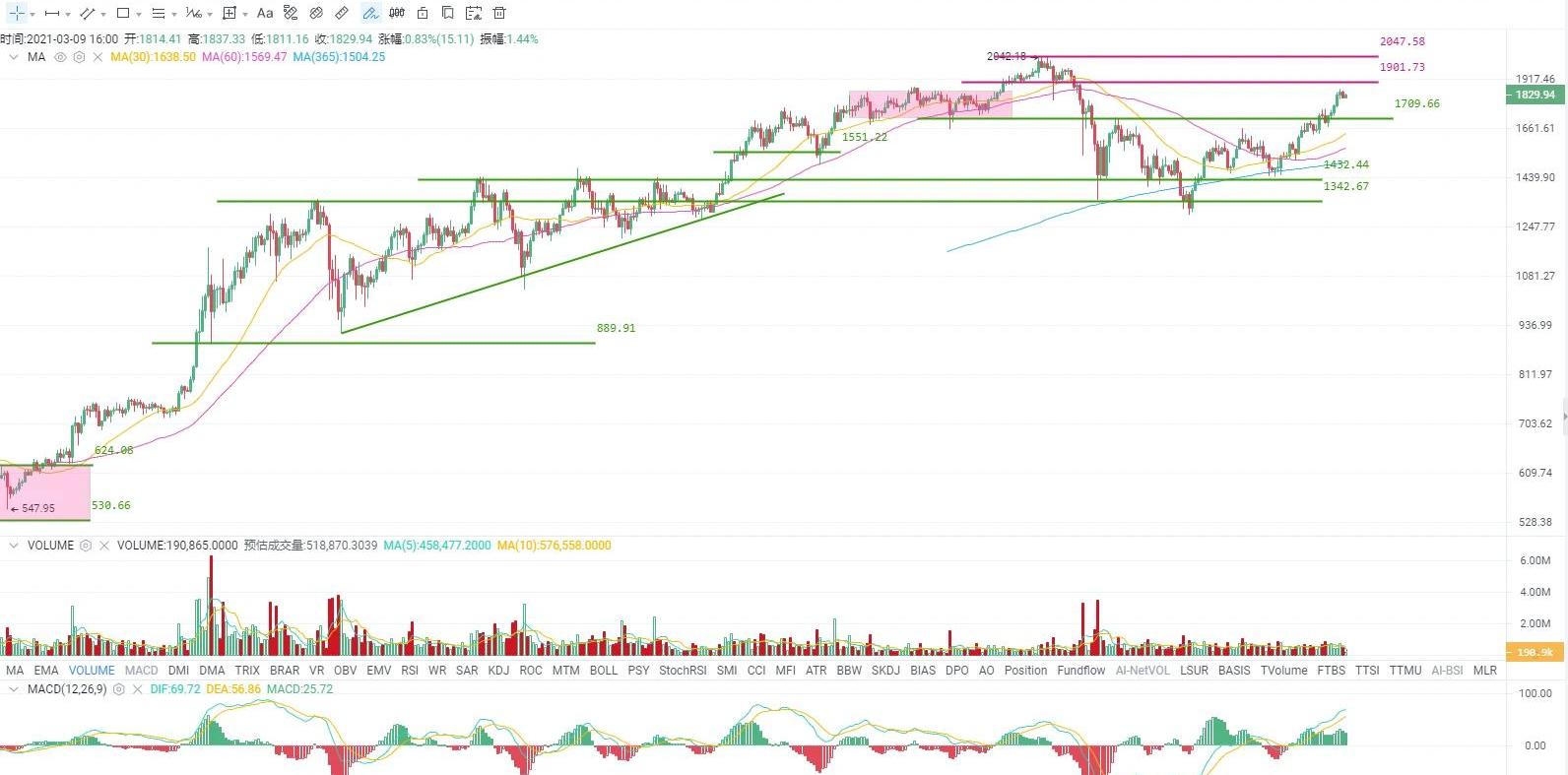 消息面:截止發稿前,美國10年期國債收益率下跌超過3%,已經自昨日最高1.608%跌至目前的1.54%。受國債收益率走低影響,市場對通脹攀升預期有所降溫,美股期貨普遍走高,納指期貨漲幅已經逼近2%。當然,這對比特幣市場也具有利好作用,在日線圖已經出現連續四天陽線,昨日出現降溫苗頭的市場情緒明顯緩和。二級市場:昨日幣價在靠近5200一線回落后并沒有持續延續跌勢,而是在49270一線獲得支撐止跌回升,在1小時圖中可以看到,當時低點剛好落在1小時級別MA60均線上。目前幣價已經上破52000一線,該價位曾經多次起到關鍵壓制作用,如今被上破意義重大,后期需要關注幣價能否持續維持在52000上方。歐易OKExETH/USDT永續合約: