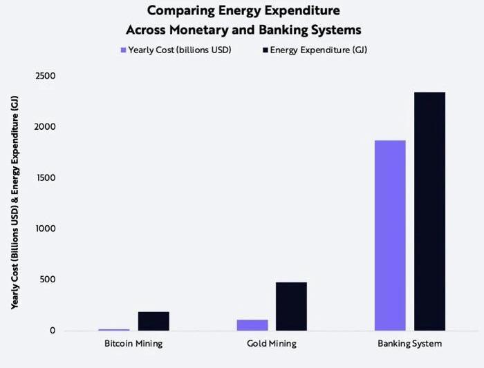 如前所述,比特幣礦工的能源消耗肯定是很高的,但如果你再去和銀行系統或黃金開采進行比較,情況就會發生很大的變化。正如方舟投資在研究中指出的那樣,"傳統銀行每年消耗23.4億焦耳,黃金開采5億焦耳,而比特幣消耗1.84億吉焦耳。"比特幣協議對能源的消耗與他們相比體量很小。歷史上第一次,我們可以把能源變成"錢",同時讓資產更加安全。