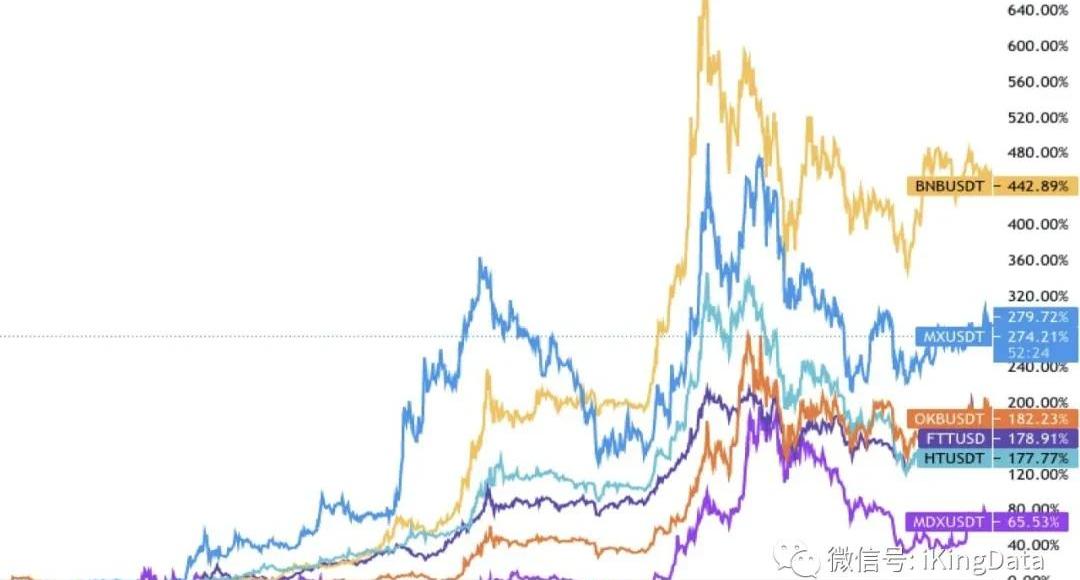 BNB/HT/OKB/FTT/MX/MDX近45天的價格對比最近45天價格表現中,HT漲幅177%,BNB漲幅最高:442%,MDX漲幅最低:65.51%,不過MDX作為去中心化交易所,剛剛上線45天。各個平臺幣“價格”對比