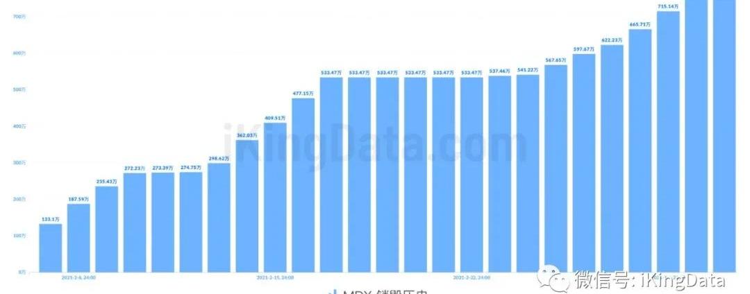 MDX總量約為10億,MDEX會使用平臺收入的66%中的30%進入回購資金池,當MDX觸發回購價格時,進行銷毀。當前MDX累計銷毀768萬枚,剩余流通總量1.06億枚。MDX銷毀數量
