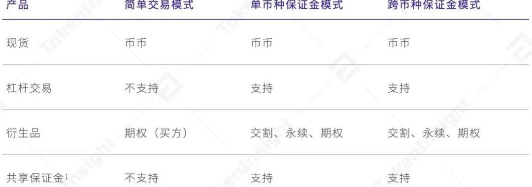 自動借幣模式與不自動借幣模式的對比,來源:歐易OKEx;TokenInsight通過對比,我們發現歐易OKEx自動借幣模式可以給投資者帶來更多的便利。從資產配置的角度來看,在借幣機制下,用戶只要保證數字資產負債在規定的額度內,系統不會交易其他數字資產償還負債,避免自動換幣規則對賬戶資產配置帶來的影響。從資金利用效率方面考慮,統一賬戶提供負債額度增加了用戶的資產規模,有助提升用戶的資金的利用效率。另外,由于自動換幣規則需要通過USDT進行周轉,因此會產生一定的交易手續費,自動借幣模式可以在一定程度上避免自動換幣規則觸發后帶來的費用損耗。2020年數字資產衍生品市場表現出有力的增長趨勢,業內各家交易所對改進保證金交易機制均有嘗試。按照TokenInsight發布的《2020年數字資產期貨交易研究報告》中的對數字資產交易所的分類方式,我們將統一交易賬戶與多家交易所的保證金交易機制進行對比分析。大型綜合交易所:大型綜合交易所提供現貨交易與保證金交易等數字資產服務,由于業務條線豐富,用戶規模龐大,大型綜合交易所對于交易機制的改進更為穩健。具體分析,Binance在2020年3月份推出混合保證金機制,用戶可以通過質押BTC、ETH等數字資產獲取USDT,從而實現對U本位合約的交易。然而該機制對資金使用效率的提升并不理想,主要原因在于:一、混合保證金機制支持的幣種較少,目前該機制僅支持BUSD、BTC、ETH、EUR質押獲取USDT,用戶無法利用其他類別的數字資產充當保證金。另外,在混合保證金機制中,BTC與ETH的質押率僅為65%和55%,較低的質押率也拖累了資金的使用效率。二、混合保證金機制覆蓋的衍生品較少,目前Binance的混合機制僅支持U本位合約的投資交易,用戶可選擇的投資品種相對有限。三、Binance的混合保證金機制無法實現保證金共享,相比于統一交易賬戶,在Binance的混合保證金機制下,不同產品條線保證金需要單獨計算,交易賬戶不能通過倉位間的盈虧互抵,增強投資者的安全邊際。考慮到Huobi目前還沒有對交易機制作出嘗試。綜合來看,統一交易賬戶對保證金機制的創新在大型綜合交易所內表現較為突出。