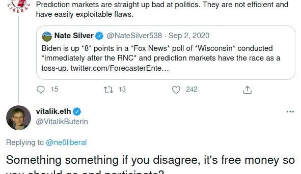我對這次選舉的第一次打賭,實際上根本不是在區塊鏈上。去年7月份,當Kanye宣布競選總統時,一位我通常相當尊重的理論家立即在Twitter上聲稱,他相信這將分裂反對特朗普的選票,并導致特朗普獲勝。我記得當時我在想,他的這一觀點過于自信,甚至可能是過度內化啟發式的結果。所以,我當然提出要賭200美元,我自己賭的是無聊的支持拜登的觀點,他欣然地接受了。9月份的選舉再次引起了我的注意,這次是預測市場引起了我的注意。市場給了特朗普近50%的獲勝機會,但我看到我的Twitter圈里有許多非常聰明的人指出,這個數字似乎太高了。這當然導致了大家所熟悉的“有效市場辯論”:如果你以0.52美元的價格購買一種代幣,當特朗普輸掉后,它可以給你1美元,而特朗普實際輸的幾率要高得多,為什么人們不直接進來買代幣,直到價格漲得更高?如果沒有人這么做,你憑什么認為自己比別人聰明?在選舉日之前,Ne0liberal的Twitter帖子做了出色的工作,其總結了當時預測市場準確的情況。簡而言之,大多數人在2020年之前使用的預測市場具有各種限制,使得人們很難以少量現金參與。結果是,如果一個非常聰明的個人或專業組織看到他們認為錯了的可能性,那么他們將價格推向他們認為正確的方向的能力將非常有限。文章指出的最重要的限制是:每個人可下注的低限額;高額費用;這就是我9月份我反對ne0liberal的地方:盡管乏味的舊世界中心化預測市場可能有低限制和高收費問題,但加密貨幣市場卻沒有!在Augur或Omen上,如果某人認為某個結果代幣的價格太低或太高,則可買賣多少是沒有限制的。然而,基于區塊鏈的預測市場的價格表現卻與PredictIt是同步的。如果市場真的因為高收費和低交易限制,從而阻止了冷靜的交易者超過過分樂觀的交易者而高估了特朗普,那么為什么沒有這些問題的區塊鏈市場,會顯示出同樣的價格呢?