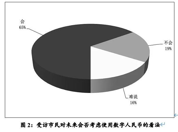 大多數人肯定電子支付的使用方便性,認為“手機支付”使用方便的人多達89%,而認為“紙幣”“刷卡”和“硬幣”等傳統支付方式使用方便的人分別為22%、19%和8%。在安全性方面,受訪市民認為“手機支付”和“紙幣”使用安全的人均在五成以上,分別為58%和53%,而認為“刷卡”和“硬幣”使用安全的人分別有31%和21%。綜合來看,多數市民肯定“手機支付”的方便性強、安全性較好;而紙幣支付方式的安全性雖獲得較好評價,但方便性評價卻顯低;對于刷卡和硬幣的支付方式,受訪市民認為其方便性和安全性均較低。鑒于手機支付方式的優勢,88%受訪市民表示今后會越來越多使用“手機支付”的比例,86%受訪市民表示手機支付“會”成為最主要的支付方式。超六成受訪市民考慮使用數字人民幣調查發現,多數受訪市民對數字人民幣的接受程度較高,明確表示未來“會”考慮使用數字人民幣的人在六成以上,為65%,而表示“不會”考慮使用的人在兩成以下,為19%,還有16%的人表示“難說”。