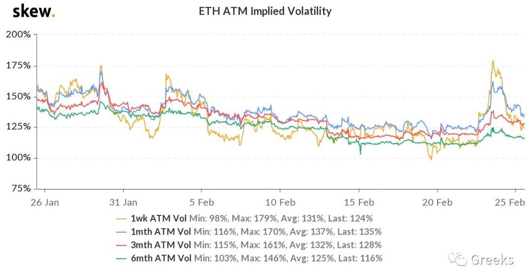ETH歷史波動率10d99%30d104%90d121%1Y113%以太坊今日期權成交量1.70億美元,持倉量25億美元,持倉量相對穩定。各標準化期限IV:今日:1m135%,3m128%,6m116%2/24:1m159%,3m135%,6m122%以太坊IV同樣有所回落,中短期IV接近年內平均水平,中長期IV低于年內平均水平。但值得注意的是,中短期skew明顯偏移,目前看跌期權并不便宜。