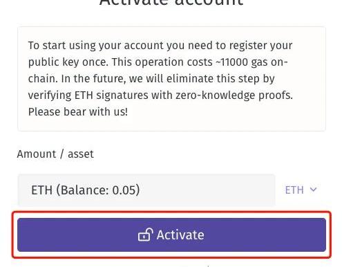 如果是和其他朋友一起進行交互,這時候完全可以兩個人互轉;沒有的話也無所謂,大家可以搞兩個地址“左右互搏”,反正最近一段時間的gas費也不是太高。需要注意的是,在轉賬之前我們需要先登記公鑰,也就是需要激活,這一步暫時仍然需要消耗一定的gas,MatterLabs也已表態后續將盡量消除這一環節。