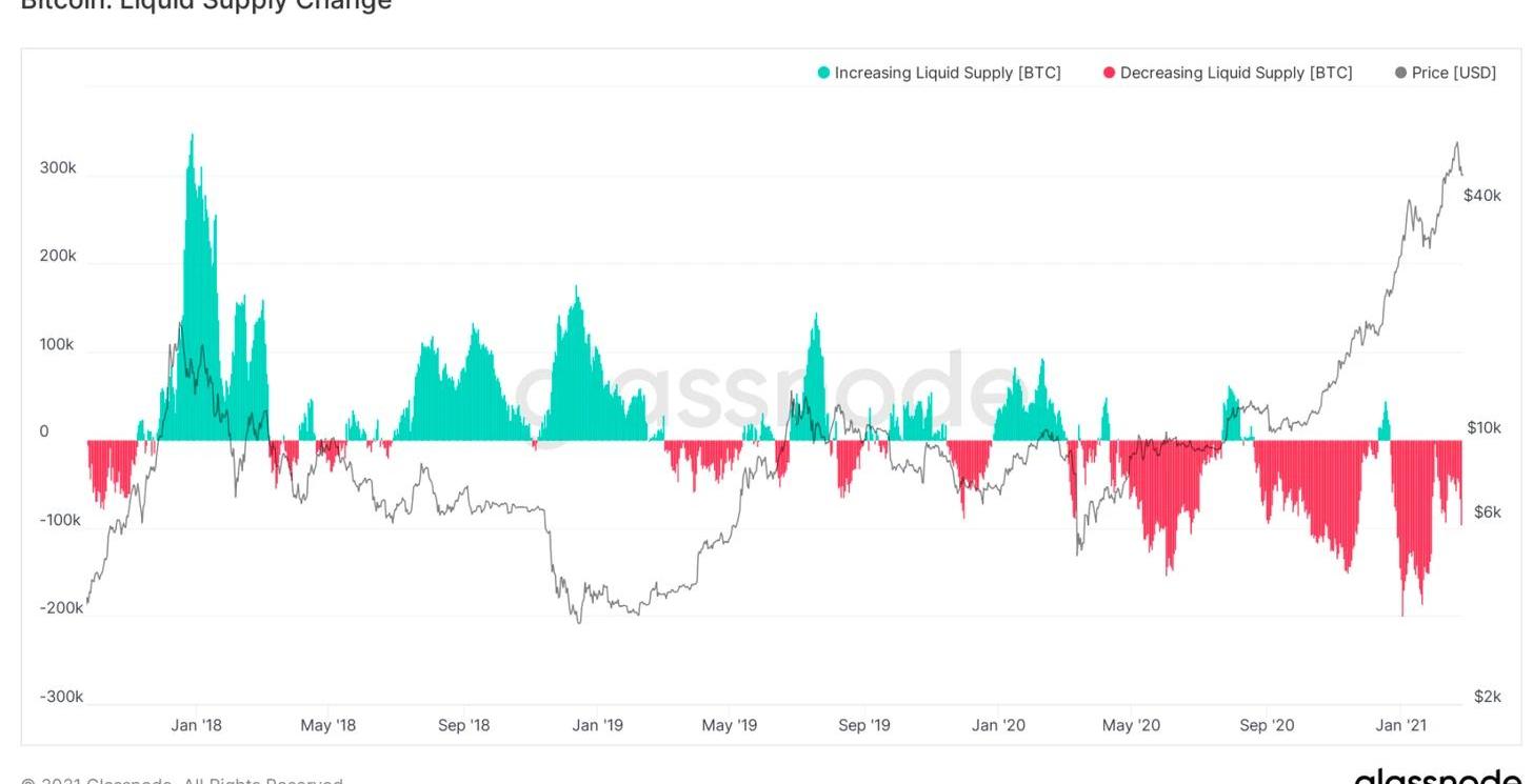 現在,我們從結構角度進一步深入研究,Glassnode最有力的指標之一“流動性供應變化”圖表顯示,盡管比特幣的價格一直上漲,但比特幣的供應量卻在進一步枯竭。這種情況在相當長的一段時間內從未發生過,它可能很快導致大規模的供應緊縮。