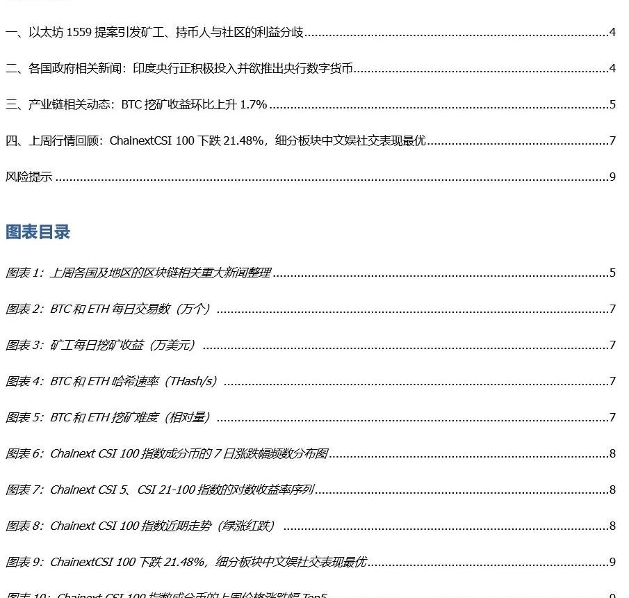 以太坊EIP-1559提案引發過半礦池反對,如何推進降費提速是以太坊最緊迫的任務。隨著DeFi等生態的崛起,以太坊鏈上轉賬費用持續高企。Gas費用過高對生態應用體驗帶來了極大的限制,勢必對生態產生擠出效應,但卻對礦工有利。為了改善生態應用體驗,以太坊靈魂人物V神提出的EIP-1559方案,該方案的核心是更改了向礦工支付Gas費用的方式,Gas費用將分為兩部分:基礎費和小費,其中基礎費將會被銷毀。由于銷毀基礎費將減少流通,有利于持幣人和社區,但卻定向減少了以太坊礦工的區塊獎勵。過去一周,曾經一度有超過一半算力的礦池明確表示反對EIP-1559,以太坊又一次面臨礦工和社區的利益再平衡局面。我們認為,以太坊目前面臨的核心問題是礦工、社區與持幣人的利益再平衡。幣價過高、Gas費用過高當然會對社區項目帶來擠出效應,但是幣價低,肯定不利于持幣人與礦工,最終也終將不利于社區的發展。這三者之間的關系類似于不可能三角,無法完美解決,只能不斷動態調整以達到平衡。而深究起來,以太坊的Gas費用計算方式亦有優化的空間。此次的1559提案很明顯對持幣人有利,但銷毀基礎費的方式亦有利于推高幣價,而幣價與Gas費用整體是正相關,這一點終究對社區有擠出效應的隱憂。按照以太坊2.0的規劃,終將轉向PoS機制,當前的PoW礦工終將要淘汰。在以太坊2.0來臨之前,面對高企的Gas費用,持幣人對幣價的訴求以及社區項目創新的持續性三者之間的關系,V神對Layer2等過渡方案有著相當的期待,而外部競爭者如波卡、BSC、HECO定會乘機爭奪以太坊的流量。當然,這些項目和以太坊之間并非完全的競爭關系,存在某種程度的融合。如何利用以太坊社區持續活躍的創新能力打造一個新的生態平衡,則是整個行業面臨的問題和機遇。上周行情回顧:ChainextCSI100下跌21.48%,細分板塊中文娛社交表現最優。從細分板塊來看,文娛社交、基礎鏈表現優于ChainextCSI100平均水平,為-17.30%、-17.93%;支付交易、物聯網&溯源、商業金融、基礎增強、存儲&計算、純幣類、AI表現遜于ChainextCSI100平均水平,為-29.90%、-27.68%、-24.86%、-26.87%、-28.35%、-21.74%、-33.86%。風險提示:監管政策不確定性、區塊鏈基礎設施開發不達預期。