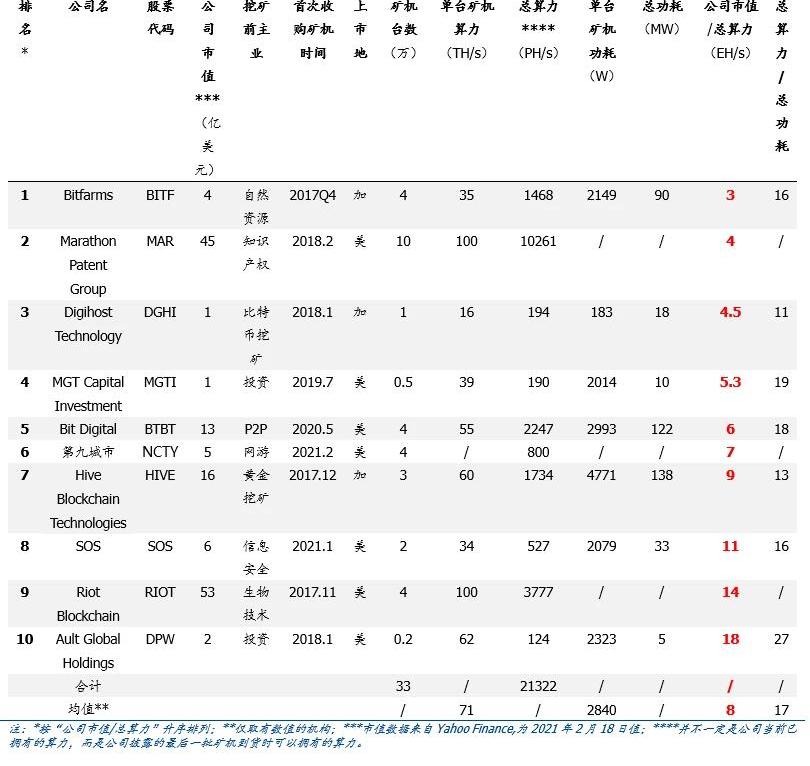 2020年底以來,比特幣“數字黃金”“抗通脹”的預期進一步強化,價格屢創新高,2021年中國春節期間更一舉突破5萬美元大關,比特幣挖礦行業水漲船高,最新日收入為3.8億元。。據統計,全球包括海外挖礦股和特斯拉在內的40家公司,已經通過挖礦或直接購買等方式,擁有了超過131萬個比特幣,超過比特幣總量2100萬個的6%,價值超730億美元。我們注意到,諸多在海外上市的公司披露了比特幣礦機購買數據,詳實度可觀,特此整理,以管窺礦機廠商市占率,并分析挖礦/礦機/礦場/礦池/買幣股的投資機會。背景:幣價上漲,礦機芯片產能受限,利好前期已有較多算力的機構。幣價上漲對挖礦收入的影響并非線性的“幣價漲—收入增”,要注意的是,1)收入端,礦工可挖得的比特幣數量與“自有算力/全網算力”正相關。幣價上漲時,理論上全網算力增加,但去年以來,礦機芯片產能受半導體需求緊張,全網算力增加緩慢,因此礦工“自有算力/全網算力”不減,即礦工可挖得的比特幣數量不減,利好礦工;3)成本端,由于礦機廠商以回本周期定價,幣價上漲時,回本周期縮短,礦機提價,挖礦成本上升,挖礦凈收入增加承壓,利空礦工。因此,我們認為,短期內挖礦形勢利好前期已有較多算力儲備的機構,而礦機廠商加碼挖礦也將成為行業有力競爭者。海外挖礦股已“狂攬”近21EH/s算力,占比特幣全網算力16%。我們發現,截至2021年2月19日,有17家上市公司披露曾購買過比特幣礦機,其中16家披露了比特幣礦機臺數,10家披露了這些礦機的算力,超過同期比特幣全網算力的16%。披露算力的10家機構礦機的單臺平均算力是71TH/s,單臺平均功耗是2840W,“公司市值/算力”均值8,“算力/功耗”均值17。“市值/算力”均值8。為了更方便地比較資本市場對各公司算力儲備的評價,我們定義了“市值/算力”比值。我們發現,10家披露了所持算力的海外挖礦股的“市值/算力”均值為8,如果九城達到比特幣全網算力的10%,其“市值/算力”比將進一步降低。要強調的是,1)并不是“市值/算力”比越低,公司的挖礦業務越被低估,因為公司可能并不以比特幣挖礦為主營業務2)與EPS不同,“市值/算力”僅與公司算力有關,而不能反映公司挖礦的成本,例如,比特幣牛市時,礦機購入成本走高,挖礦凈收入不一定高。加速入場,狂攬算力,MARA、RIOT、BTBT占先發優勢,九城增速較快。根據我們的統計,10家披露了所持算力的海外挖礦股共持有近21EH/s比特幣算力,占全網16%,而這21EH/s中,MARA、RIOT、BTBT所持算力占82%,分別為10.3EH/s、3.8EH/s、2.2EH/s,先發優勢明顯。第九城市在宣布轉型后也加了礦機采購力度,增速較快。投資建議。建議關注:1)挖礦股:MARA、第九城市、RIOT、BTBT。2)礦機股:嘉楠科技、億邦國際、英偉達等。3)礦場股:DMGI;4)礦池股;5)買幣股:Microstrategy、特斯拉、GBTC等;6)交易所:火幣科技、歐科云鏈;7)其他:中嘉博創、雄岸科技等。風險提示:幣價波動,監管收緊,數據統計偏差。