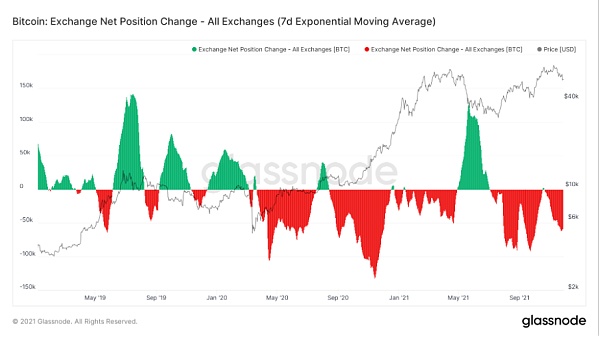 由于中心化交易所仍然是比特幣交易的主要場所,所以監控交易所的比特幣余額動態是對未來行情走向的一個很好的參考。