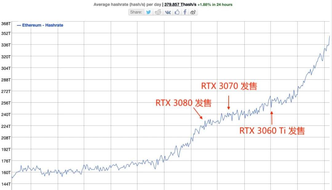 圖源網絡以太坊近半年增加算力相當于130萬張英偉達RTX3080近一年,以太坊算力增長了130.46%,達到了361Thash/s,相當于600萬張英偉達RTX3070顯卡。