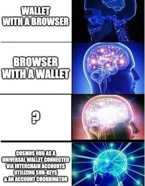 https://www.albrow.com/things在論壇帖子《作為通用錢包的CosmosHub》中,我提出了用戶和區塊鏈之間的未來主義關系,這涉及到當前Cosmos-SDK和即將到來的功能的組合。"子私鑰"被稱為InterchainAccounts的標準以及CosmosHub本身的安全性。這是一種充滿想象力提案,但它讓我思考我們需要進入一個安全且易與許多區塊鏈交互的未來。不過這到底需要哪些步驟,我提出了一條前進的道路,其結果是將關注點分離,并建立一類新的錢包,創立賬戶協調功能。