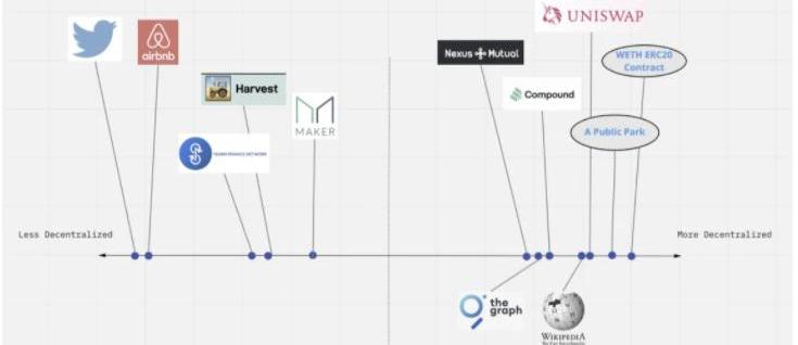 誠然,對于一個協議或應用程序來說,理想化的去中心化意味著任何人都可以從一個規則不變的系統中反復獲得價值。第一,我之所以說「獲得價值」,是因為我想排除一些東西,比如一個被破壞的智能合約。當然,任何人都可以使用它,而且它不會改變,但是它沒有價值,所以在討論「去中心化系統」時包含它不是有趣的。第二,我說「反復」,因為我們也應該排除明顯不可持續的東西,比如一次性空投,或者一些免費的智能合約。第三,「規則不變」這一部分可能是去中心化最有趣、最不容易理解的部分。有無數的產品和服務,任何人都可以反復獲得價值,但這些服務沒有去中心化的關鍵原因是,任何規則都可以隨時更改,用戶通常不能選擇退出這些更改而不失去對原始產品的訪問。事實上,我想說的是,這種數字系統穩定性的想法是密碼技術所提供的獨特突破。幾千年來,我們一直能夠利用公園進行鍛煉、體育活動或市場活動,并確保公園不會在明天豎起圍墻或向你收費。但我們的數字空間沒有這樣的等價物,我們只能在網上建立私有財產,隨著這些利益的錯位,我們永遠無法確定接下來會發生什么。但區塊鏈最終為我們提供了創造公共、有價值和穩定的數字空間的能力。如果我們愿意的話,我們也可以建立不僅僅是空間——我們可以建立數字圖書館、競技場和整個去中心化行業。判斷去中心化程度的框架