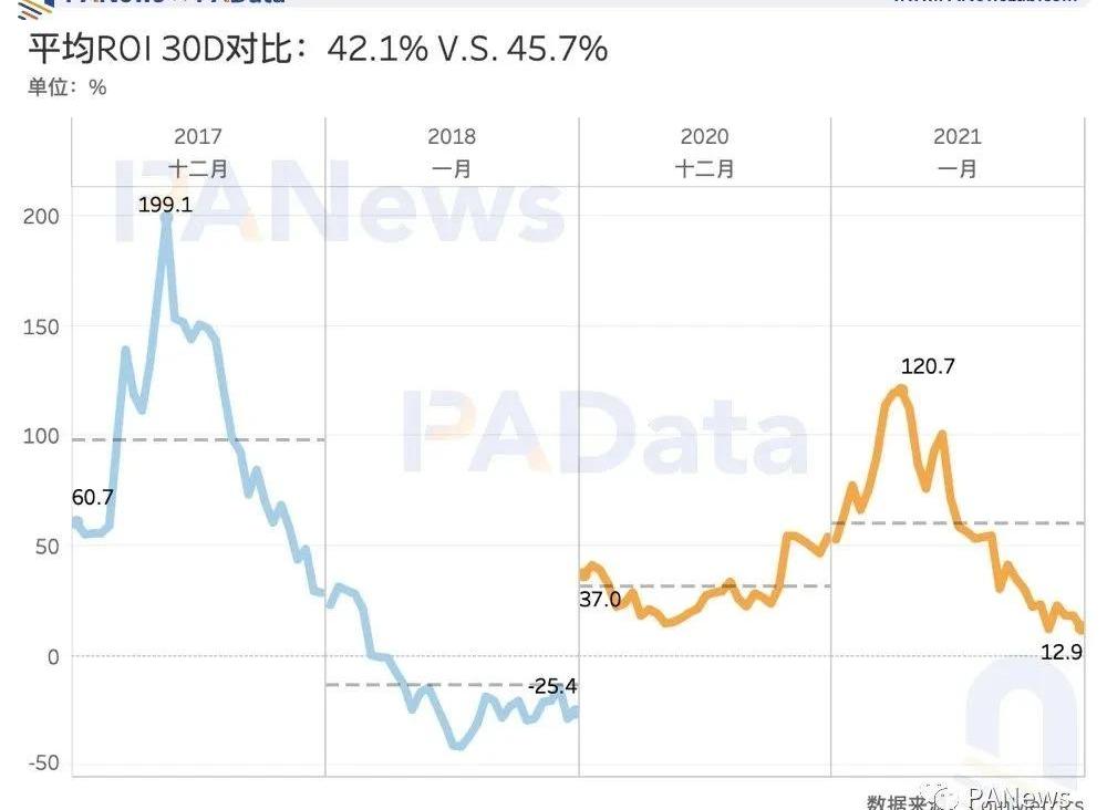 本輪牛市相較17/18年牛市的一大顯著特點是幣價漲幅更高,但波動性更小。根據CoinMarketCap的統計,17年12月至18年1月期間,幣價的峰值約為19497美元,最高漲幅約為77.63%,而1月實際已進入下跌通道,1月末的幣價大約為10221美元,兩個月的整體漲幅為-6.88%。而20年12月至21年1月期間,幣價的峰值達到了40798美元,最高漲幅約為116.98%,兩個月的整體漲幅也達到了76.11%。