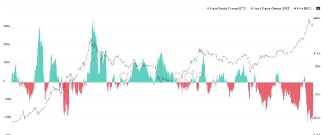 來源:Glassnode流動性供給變化顯示,近期比特幣購買者正在將比特幣從交易所拿出來,存入冷錢包。存儲在交易所的比特幣是流動性的,存儲在冷錢包中的比特幣是非流動性的。這種從流動性到非流動性的變化,進一步限制了比特幣在公開市場上的供應量,隨著需求的增加,對價格產生了上行壓力。