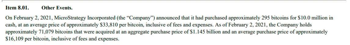 2、億萬富翁PaulTudorJones參投新加密基金,基金規模達7200萬美元據CoinDesk2月4日消息,英國說唱歌手兼企業家LLCoolJ當前正在投資加密初創公司NorthIslandVentures。NorthIslandVentures計劃建立規模達7200萬美元的加密基金。而據悉,億萬富翁、傳奇基金經理PaulTudorJones也參與其中。NorthIslandVentures是一家專注于加密貨幣領域的風險投資公司,保羅·都鐸·瓊斯是世界著名的對沖基金經理,去年5月曾向媒體透露其已將超過1%的資產配置到了比特幣上。3、古根海姆公司購買5億美元GBTC生效2月1日,Bloqport發推稱,古根海姆公司向SEC提交的“購買5億美元GBTC”的文件正式生效,該文件是由古根海姆合伙公司旗下基金信托在去年11月27日向SEC提交的。古根漢姆是一家知名的投資管理公司,管理資產超過2650億美元,主要代表企業、養老基金和主權財富基金對各種資產類別進行投資。古根漢姆公司入場也是最近加密貨幣市場的積極信號,表明越來越多宏觀投資機構開始對比特幣感興趣并真正布局。4、Microstrategy再增持1000萬美元的比特幣2月2日,Microstrategy官網公布數據顯示,Microstrategy官方已再次購買1000萬美元的比特幣,購買均價為33810美元。作為目前持倉比特幣數量最多的上市公司,Microstrategy在2020年開始瘋狂買入比特幣,作為其公司的戰略儲備資產。截至2月,Microstrategy共持有71,079枚比特幣。