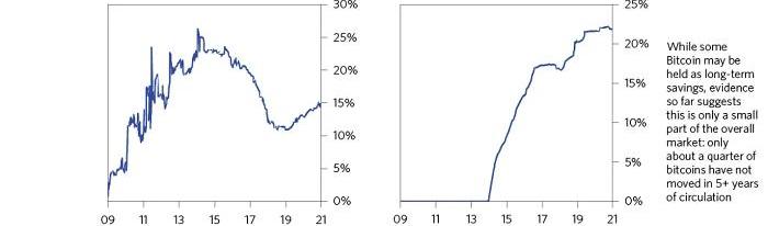 如果財富的基本目的是隨著時間推移保留或增加人們的購買力,我們認為比特幣感覺更像是一種選擇,但仍然是一種具有高度波動性和投機性的資產。與市場上現有的價值存儲等價物相比,比特幣尚未廣泛被用作為儲蓄工具或儲備資產,政府或全球大型機構投資者者也沒有“真正”的參與比特幣資產配置。即使近期關注比特幣的私人機構投資者參與度有所增加,但仍有很大一部分投資者似乎仍在使用比特幣進行短期投機交易,而不是將其用作實際的長期儲蓄工具。雖然很難直接確定相關情況,但是下面的圖表顯示了用作儲蓄的比特幣份額的兩種方式。具體而言,一個是比特幣在累積帳戶中所占的份額,另一個是比特幣在超過5年的“最新活躍”帳戶中所占的份額。累積賬戶是只購買了比特幣而未售出任何賬戶的賬戶,而“上次活躍”的代幣是長期投資者和很可能損失的代幣的混合體。我們看到,雖然自2018年以來,長期持有比特幣的用戶數量有所增加,但他們的總份額仍然很小。而且,盡管相當一部分比特幣在5年以上都沒有動靜,但大部分比特幣供應量仍處在活躍或半活躍的流通狀態中。