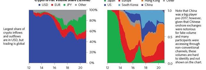 我們嘗試確定為什么持有比特幣的另一種方式是查看交易額,與黃金相比,比特幣的高交易額可能反映了其相對投機性。而與比特幣相比,黃金的交易額占未償還總資產的百分比幾乎微不足道,之所以會出現這種現象,部分原因是世界各地的中央銀行都擁有大量黃金總供應量,并將其作為長期價值儲備。另一方面,由于高頻交易者的出現,繁榮的衍生品市場、以及與比特幣進行交易的其他代幣數量激增,近年來比特幣交易額激增。再加上不受監管的加密貨幣交易所報告交易量數據存疑,也給市場造成了流動性增加的錯覺。實際上,這種流動性除了存在長期流動性風險之外,也更多地代表比特幣交易存在高流失率和投機性問題。