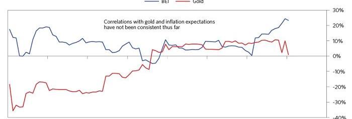 比特幣只有不到11年的歷史,還沒有足夠的證據證明比特幣能夠讓人們認為它可以像黃金一樣在未來成為可靠的多樣化投資選擇。盡管如此,我們依然研究了市場上的現有數據,旨在了解比特幣在對沖通脹和投資組合縮水方面所扮演的角色和作用。如下圖所示,2021年,隨著通脹預期的上升,比特幣普遍升值,但相比于長期扮演通脹角色的黃金,比特幣似乎相對較弱。