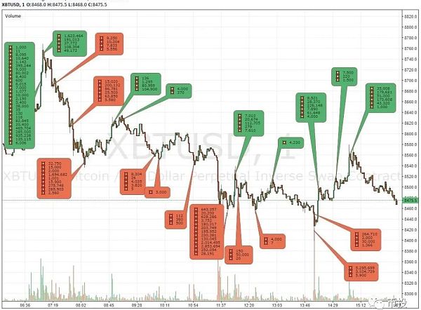 從圖中可以發現:每當主力資金出現連續的大額爆倉,行情在小周期內就反轉的概率非常高。如果反映到數據和指標上來看的話,一旦成易量急速擴大,且伴隨著大額爆倉數據的增加,就可以考慮入場做趨勢的對手盤。