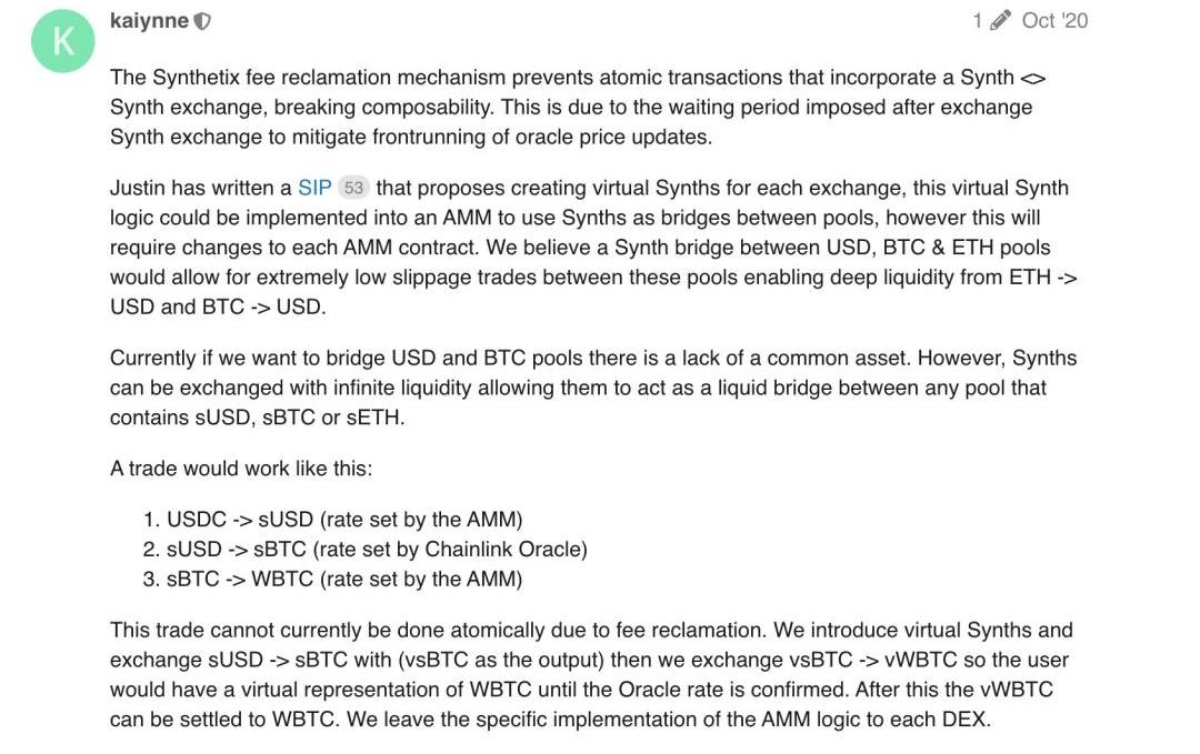 因此,Synthetix社區開始萌生想法:如果虛擬資產之間的交易無滑點,那么是否可以將這一特點跟其他的AMM結合,讓其他的交易平臺上大額交易,也能降低交易滑點?10月份在Synthetix社區提案論壇中的一次討論,也開始將這一點提上日程。