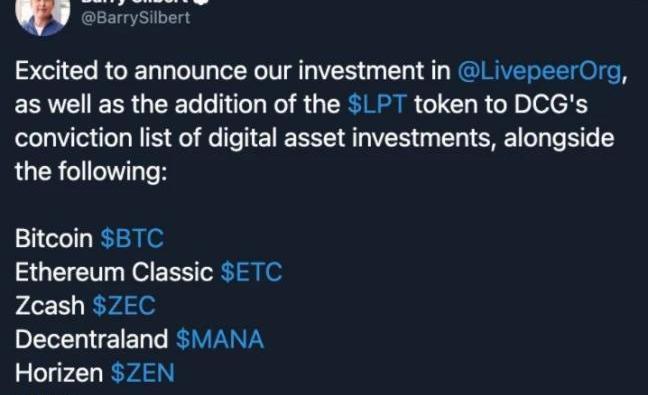 1月22日,美國特拉華州公司備案網站顯示,灰度信托又組建了新的信托公司,擬新增6個新Token,包括LINK、XTZ、MANA、FIL、LPT以及BAT。這意味著,灰度即將把這些不如比特幣、以太坊一般主流的Token擺上「貨架」,為合格的投資機構和個人投資者開放敞口。早前的大半年時間里,加密資產市場已經見識過灰度的強大號召力和龐大的資管規模,灰度不斷增持BTC、ETH等幣種,一定程度上推動了加密資產牛市到來。因此,在灰度「上新」的消息傳出后,上述6種Token紛紛在二級市場開啟上漲模式。自1月22日至1月25日的3天里,LINK、XTZ、MANA、FIL、LPT、BAT分別上漲28%、21.8%、38.5%、5.7%、174%和28%。二級市場的投資者們將灰度視為投資的風向標,大把資金涌入到上述6種資產中。此次灰度列出的新Token中,「山寨幣」居多,往往市場價格波動也較大,參與上述信托投資的風險也隨之增加。一向追求合規以及偏愛主流資產的灰度,為何選取了這些Token?很快它的這波操作被業界深扒。眼尖的投資者注意到,上述6個Token中,MANA、LPT、BAT都與灰度有著緊密的關聯,本月剛剛辭任灰度CEO一職的BarrySilbert曾多次為MANA、LPT「喊單」。在2019年,BarrySilbert擔任灰度CEO期間,他曾在推特透露,灰度母公司DigitalCurrencyGroup投資了LPT。此外,MANA和BAT也在DCG的投資組合中。在此前的個人推特簡介中,BarrySilbert列出了他的個人持倉Token,其中既包括BTC、ETH,也有MANA、LPT、ZEN等資產。
