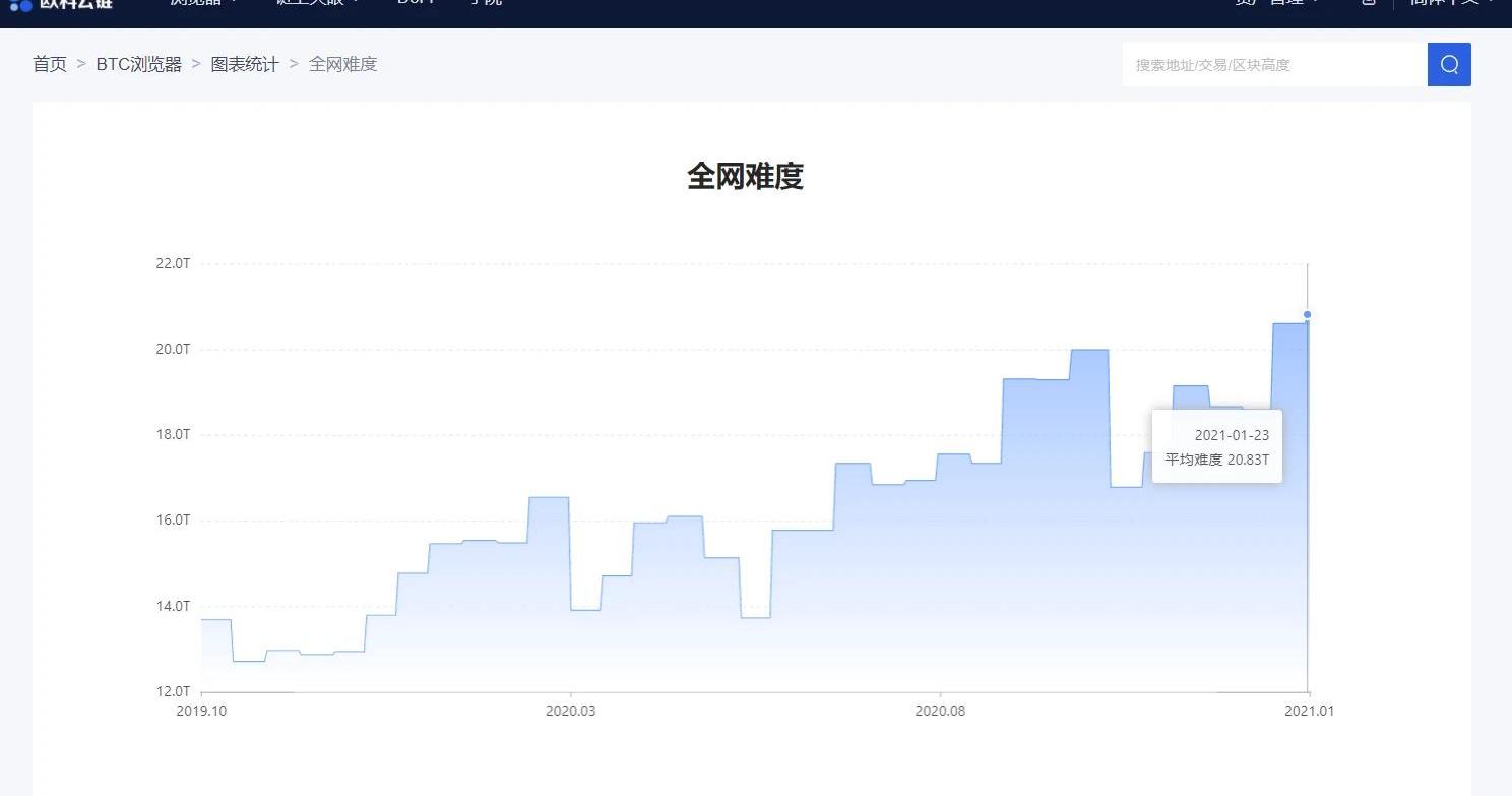 在排除重復數據的影響后,比特幣單周的鏈上實際交易量為420.26萬BTC,環比下降14.1%。隨著比特幣開啟下行和調整,比特幣網絡上的交易活動和活躍度均有一定程度的回落。雖然鏈上活躍度有所回落,但也有一些好消息:比特幣網絡難度在周末上調至20.83T,這是有史以來的最高位。
