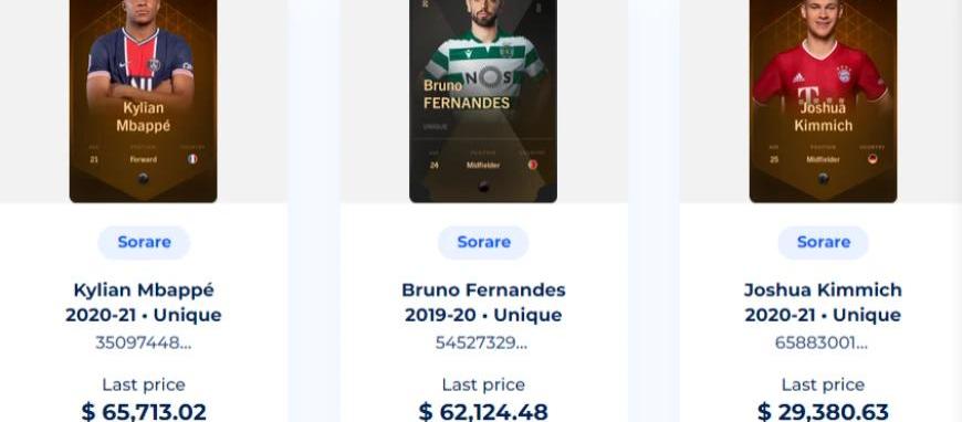 2020年11月10日以來,Sorare游戲中最昂貴的球員卡如下圖顯示,均是稀有等級為unique的球員卡。其中排名第一的球員卡高達65,713.02美元。卡面主角基利安·姆巴佩,1998年12月20日出生于法國,職業足球運動員,場上司職前鋒,效力于法國足球甲級聯賽的巴黎圣日耳曼足球俱樂部。2018年,基利安·姆巴佩入選法國國家隊2018年俄羅斯世界杯最終名單并隨隊獲得冠軍及2018年俄羅斯世界杯最佳新秀獎。