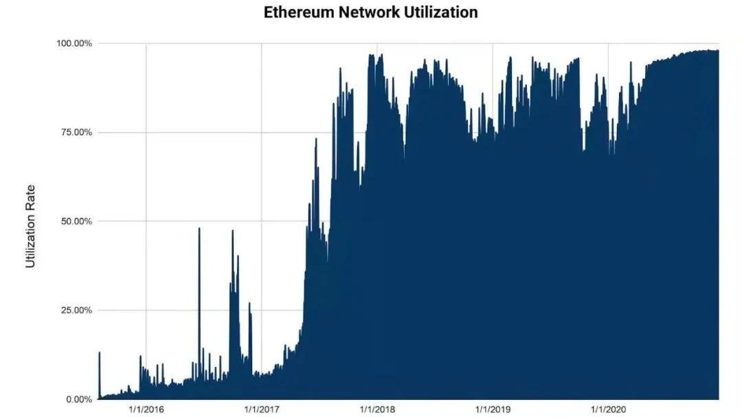 1、網絡利用率爆滿,“全球結算層”更進一步網絡利用率可以說是衡量任何公鏈運行狀況的最基本指標之一,它意味著大家對以太坊區塊空間的需求,也即用戶是否愿意使用ETH作為結算層,而這個指標2020年以來就穩步上漲,達到歷史峰值。最多的還是借助DeFi的東風——當下無論是貸款還是交易,無論是Aave還是Uniswap,都離不開對以太坊網絡的需求,它明顯已成為整個區塊鏈網絡中的最大“結算層”,距離“全球結算層”的目標更進一步。