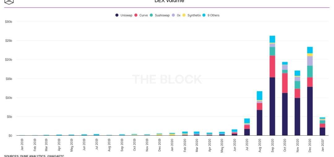 6、DEX交易量迎來爆發式增長Uniswap、Curve、Balancer等DEX無疑在2020年給了我們意料之外的驚喜,尤其是在Uniswap的帶領之下,成為挑戰CEX的“現象級對手”數據上看,目前DEX市場份額上升到CEX的15%,月交易量飆升至超過250億美元,未來也更值得期待。