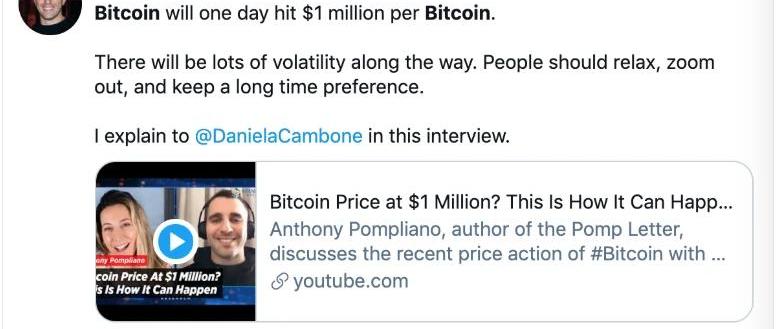 很多人可能不明白一個事情,現在無論是Paypal還是MicroStrategy又或者是灰度,任何單獨一家每天的買入量都超過了比特幣的產出量,而當比如Paypal買入的是每日的產量的話,那灰度和MicroStrategy買入的正是你拋出去的比特幣,至少從目前看,這三家公司都是只進不出的需求方,還有更多的其他機構在買入,也是做長期屯比的準備,如今市面上比特幣的流通量是越來越少的,再下去的話只會變得更少,所以拋出手中的幣時一定要謹慎。前段時間下跌的時候,各大投行都在潑冷水,但是不妨礙這些機構繼續看好比特幣,包括昨天摩根溪聯合創始人Anthony?Pompliano今日發推稱,比特幣的價格總有一天會達到每枚100萬美元。在這一過程中會有很多波動,人們應該放松,保持長時間的偏好。