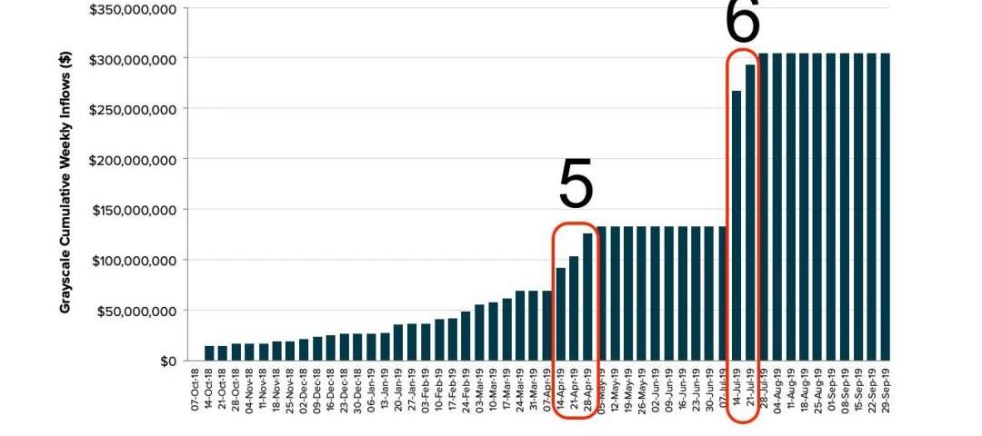 記住,比特幣可以是5000美元,也可以是50000美元,以BTC為單位的回報率是不會改變的。重點是以比特幣的數量來增長投資組合。只要溢價存在,投資者就會增加自己的持倉。現在回到轉債的低潮期,第5和第6檔這兩檔是獨特的,解鎖發生在信托公司從12個月的鎖定期轉為只有6個月的鎖定期。規則改變發生在2020年1月21日,需要90天才能生效。我不確定這是否適用于已經在解鎖時限內的股票,還是只適用于新發行的股票。一會兒我會給你看,我的直覺說,它并不適用于已經處于待售狀態的股票。這里是第5批和第6批。如你所見,第6批使信托基金的流入量增加了一倍多。